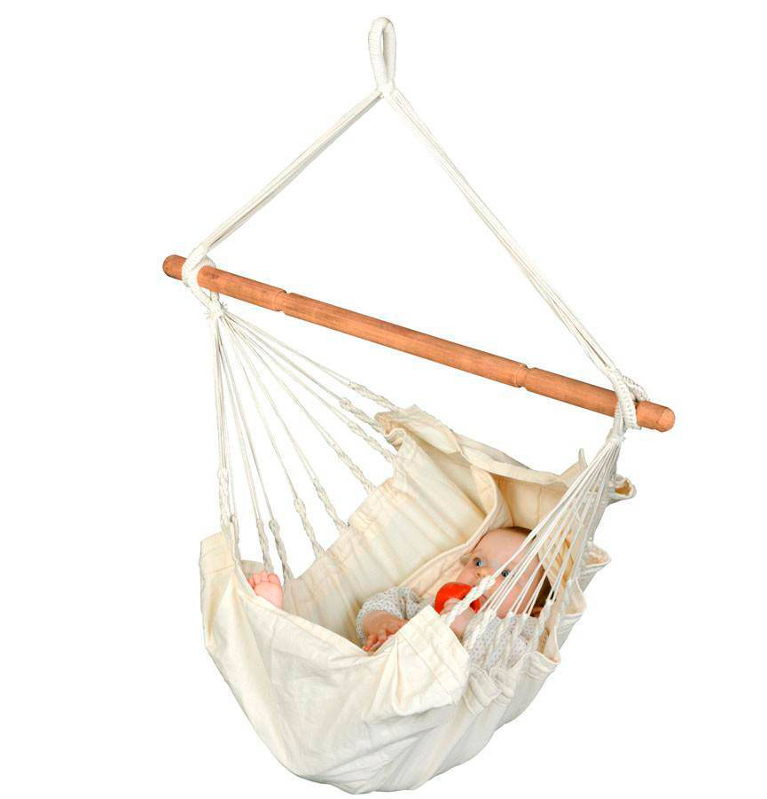 Этот гамак разработан специально для младенцев. Представляет собой безопасную колыбель, позволяющую раскачивая убаюкать даже беспокойного малыша. Гамак безопасен – ребенка можно пристегнуть надежным фиксирующим ремнем, а большое количество канатов, ведущих к подвесу, обеспечат равномерное распределение веса. Ткань изготовлена из органического хлопка, наполнитель одеялка также из хлопка, деревянная перекладина из индийской акации. Несколько режимов положения и наклона позволят установить гамак максимально удобно для малыша. Подходит для деток от рождения до 12 месяцев.
