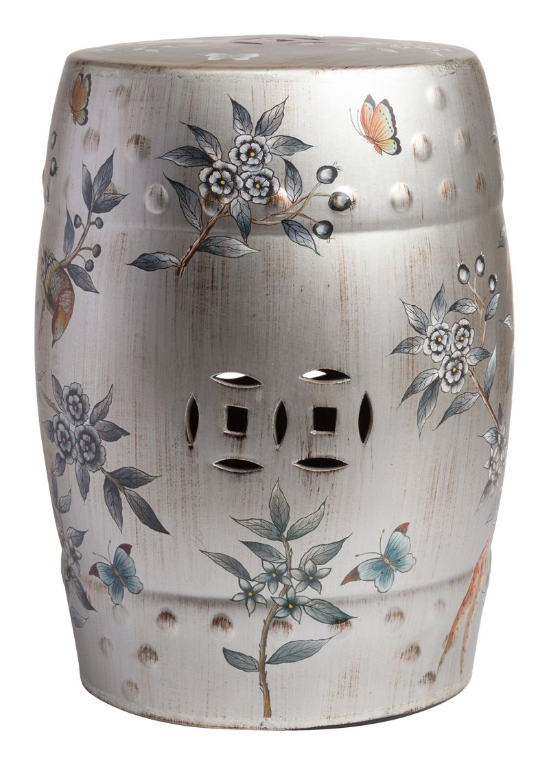 Это предмет мебели, который удачно сочетает в себе сразу две функции — его можно использовать и как стол, и как табурет, в зависимости от вашего желания. Примечательно, что эта модель выполнена не из дерева, как следовало бы ожидать, а из грубой керамики. Столик-табурет выполнен в серебряном цвете и украшен яркими цветами, птицами и бабочками. Такой столик-табурет будет уместен в интерьере с элементами любого стиля.