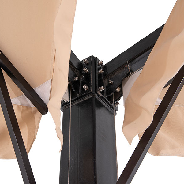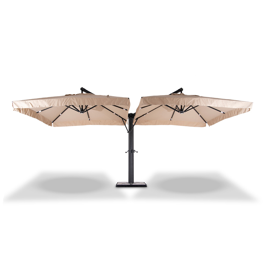 Двухкупольный зонт с равными сторонами 3x3м на центральной металлической опоре. Тент изготовлен из качественной водоотталкивающей ткани Spunpoly плотностью 310 г/м2, устойчивой к выгоранию на солнце.