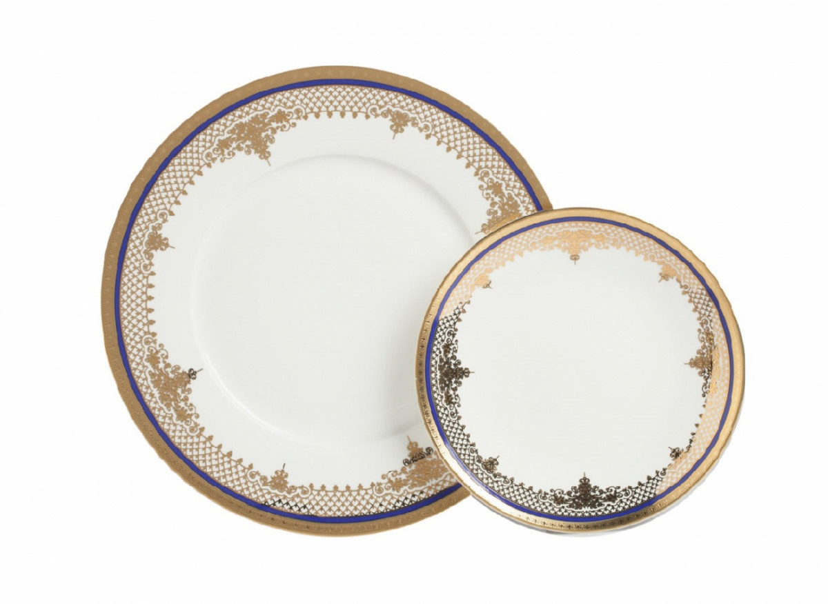 Комплект тарелок Wander из тончайшего костяного фарфора диаметром 20 и 25,5 см украшен изящным золотым орнаментом в восточном стиле и контрастно выделяющейся синей окантовкой. Комплект можно приобрести как отдельно, так и в дополнение к чайной паре из той же коллекции.