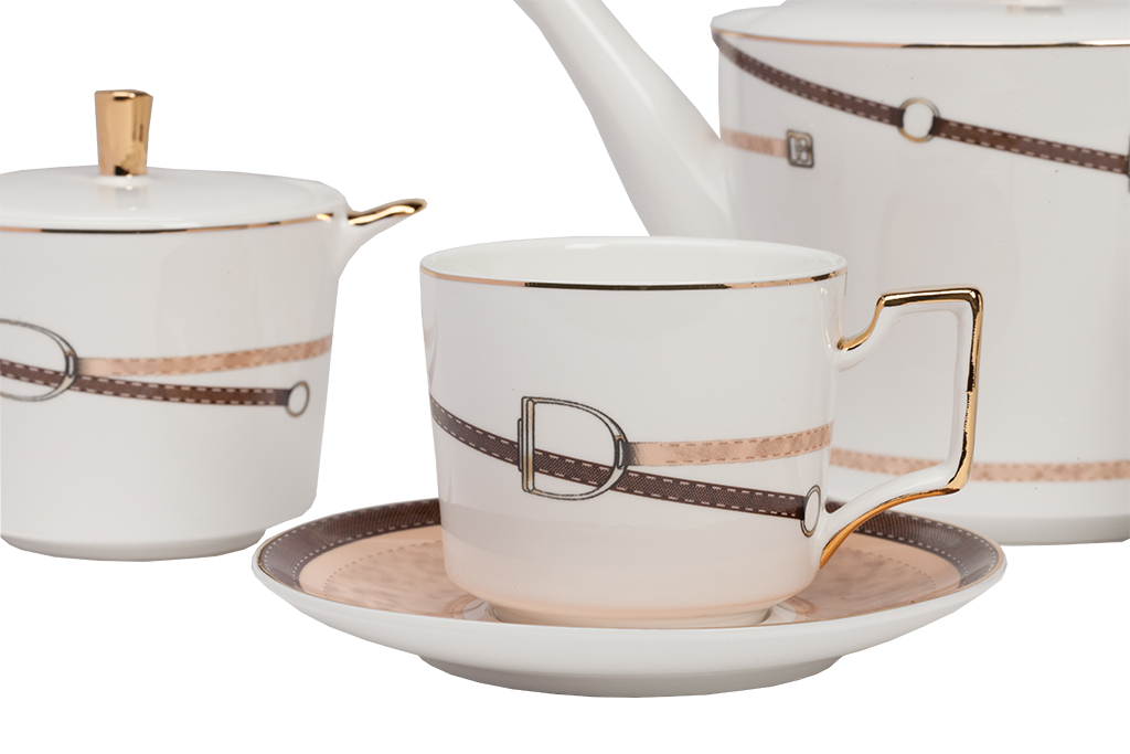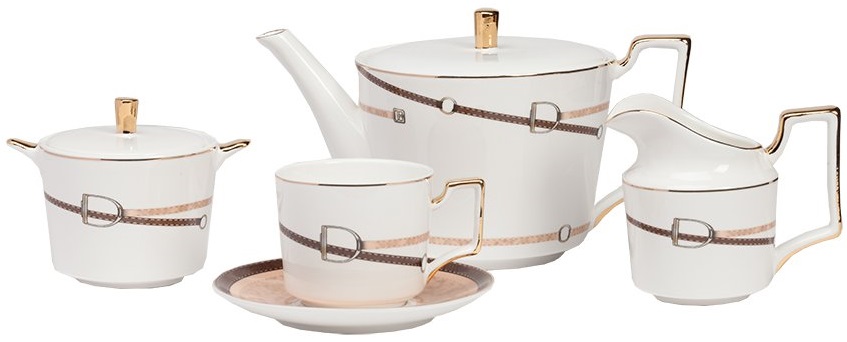 Чайный сервиз Flavour выполнен из костяного фарфора на 4 персоны, состоит из чайника, молочника, сахарницы и 4 пары чашек с блюдцами. Предметы сервиза расписаны в коричневых тонах минимализированным рисунком в виде ремешка с красивой пряжкой, ручки и края предметов декорированы золотой обводкой. Такая элегантная роспись подойдет к любому стилю сервировки. Сервиз можно приобрести отдельно и в дополнении к другим предметам данного стиля.