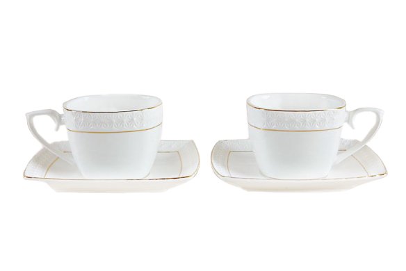 Посуду отличает лёгкость, молочно-белый цвет, отводка с содержанием 10-ти процентного настоящего золота, оригинальность формы и рельефа.