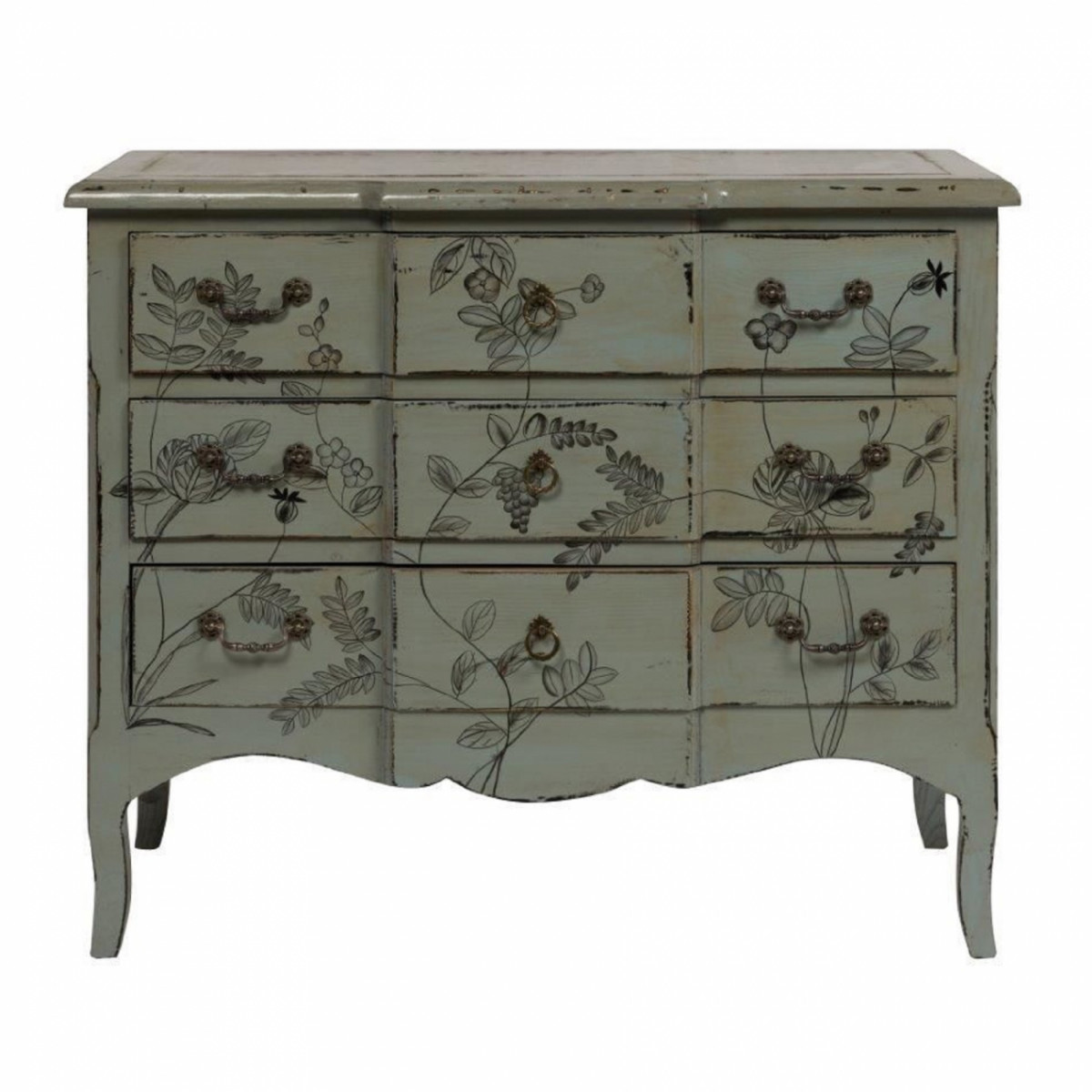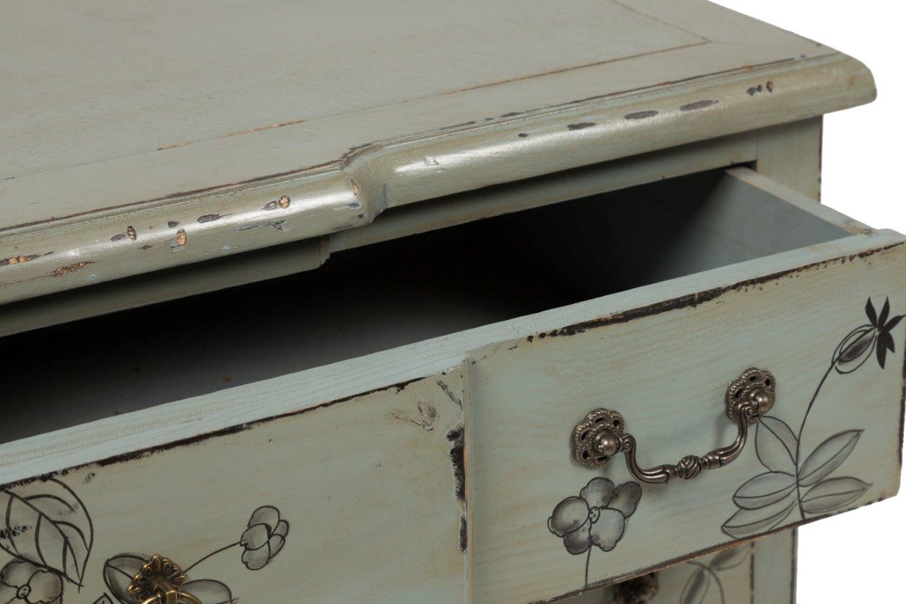 Комод Ombrecho отличается особенным романтизмом и нежностью оформления. Изящный силуэт, поставленный на основание с плавными изгибами, превосходно смотрится благодаря отделке росписью с цветочными мотивами. Такой комод отлично будет дополнять спальню в прованском стиле, которой нужно чуть больше поэтичности. Дизайнеры приложили немало усилий, придавая этому комоду эффект старины. Этой модели можно смело дать не один десяток лет, хотя массив вяза прослужит значительно больше. Светло бирюзовая окраска корпуса мебели разбавлена оригинальной цветовой композицией, с которой гармонично переплетаются металлические ручки. Комод Ombrecho Серый, Зелёный