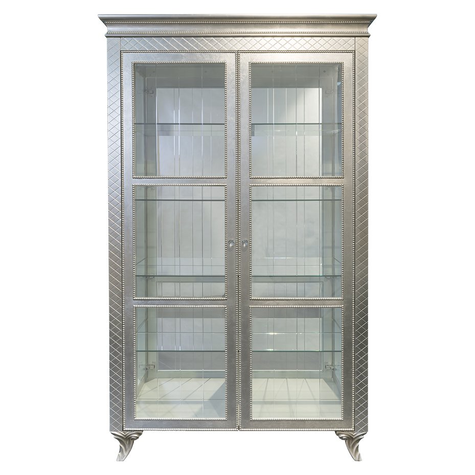 Витрина выполнена в стиле Ар деко. Отделка сусальное серебро, фасад и боковые части - стекло. Внутреннее наполнение 4 стеклянных полки.