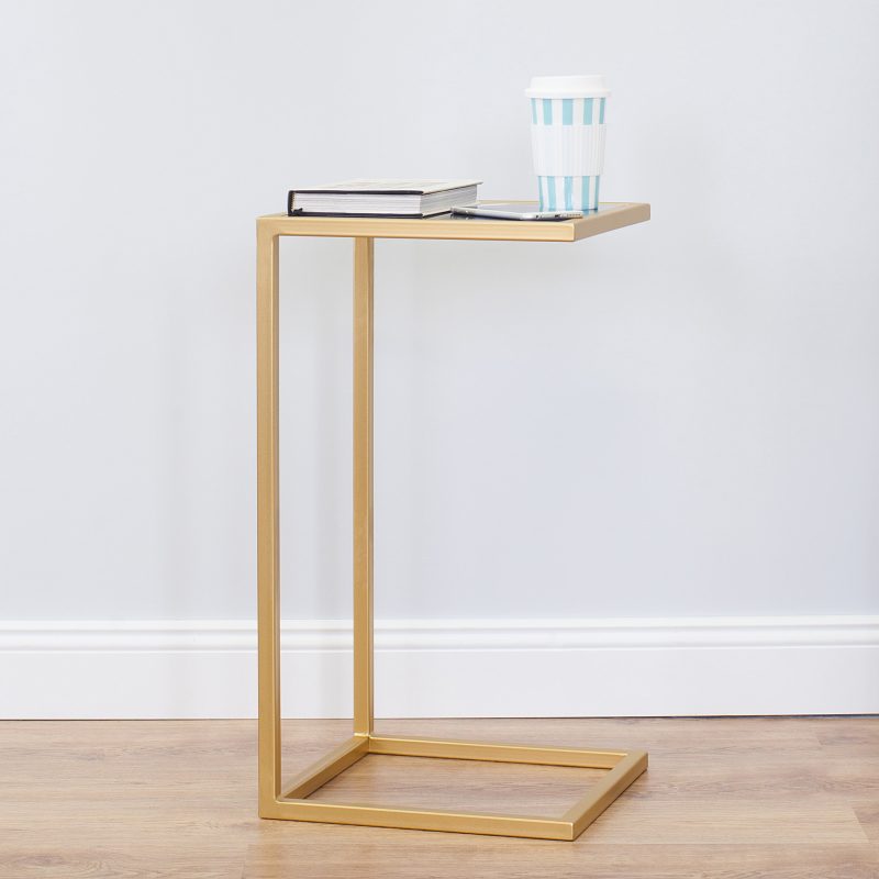 Стильная лаконичная модель прикроватного столика подойдет для любой спальни или гостиной. Золотой металлический корпус и аккуратная столешница 35х35 см из темного стекла прекрасно впишется в любой интерьер. Возможность его развернуть позволяет устраивать поздние воскресные завтраки в постели или работать с ноутбуком, удобно расположившись на диване.
