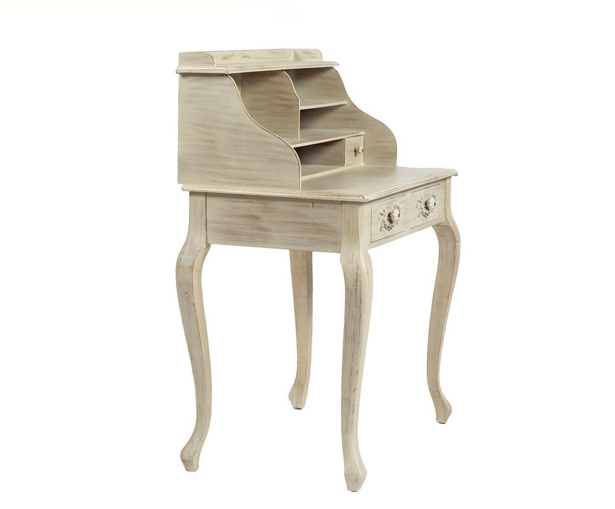 Письменный стол Julie – яркий представитель модного стиля «шебби-шик»: приятный нежный цвет, искусственная состаренность, уникальный дизайн. Выдвижные ящички и дополнительные полочки позволят вам хранить как важные документы, так и милые, дорогие сердцу безделушки. Благодаря небольшому размеру предмет мебели займет немного места, при этом привнеся в комнату дополнительный уют и очарование. Письменный стол Julie кремовый