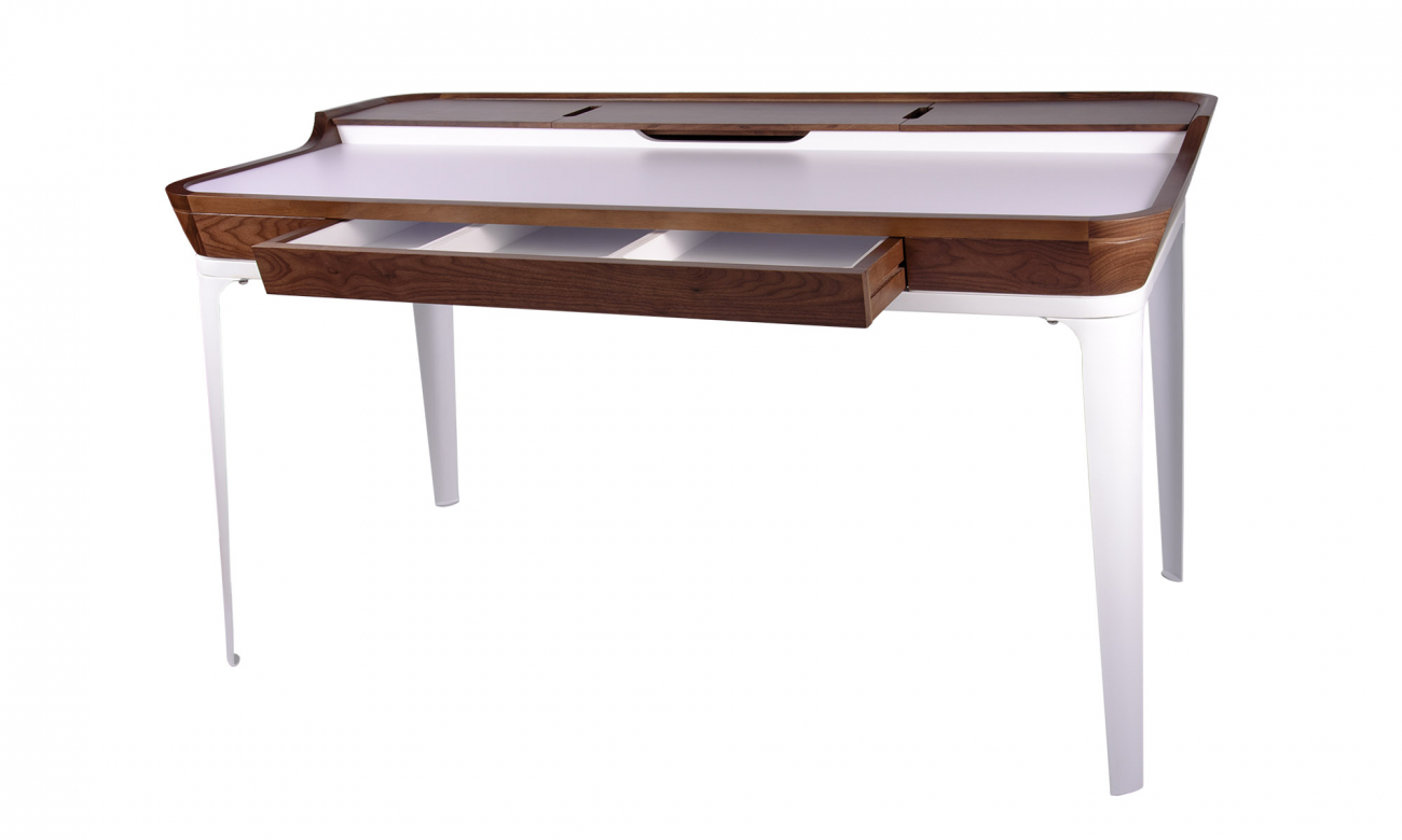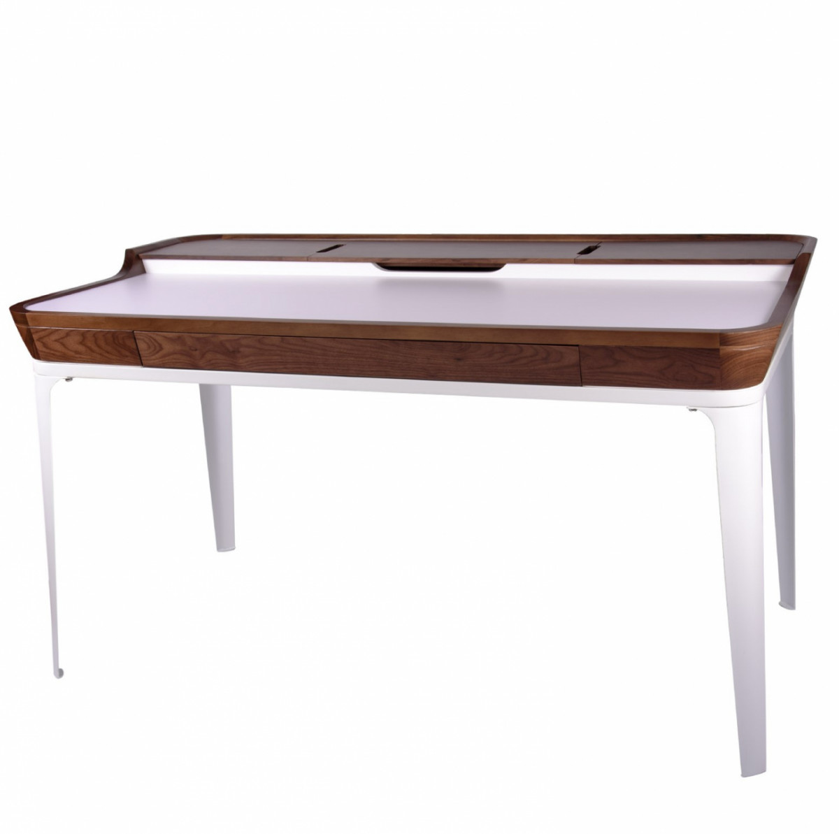 Эксклюзивный письменный стол Bistup станет настоящим украшением домашнего кабинета в стиле хай-тек с элементами классики. Выполненный из металла и дерева, стол сможет добавить изящества и роскоши вашему дому. Контраст в сочетании теплого, чуть притемнённого обрамления столешницы из массива американского ореха и снежно-белого поля стола создает любопытный эффект. Это покупка для тех, кого интересует дизайнерская мебель в современном стиле.