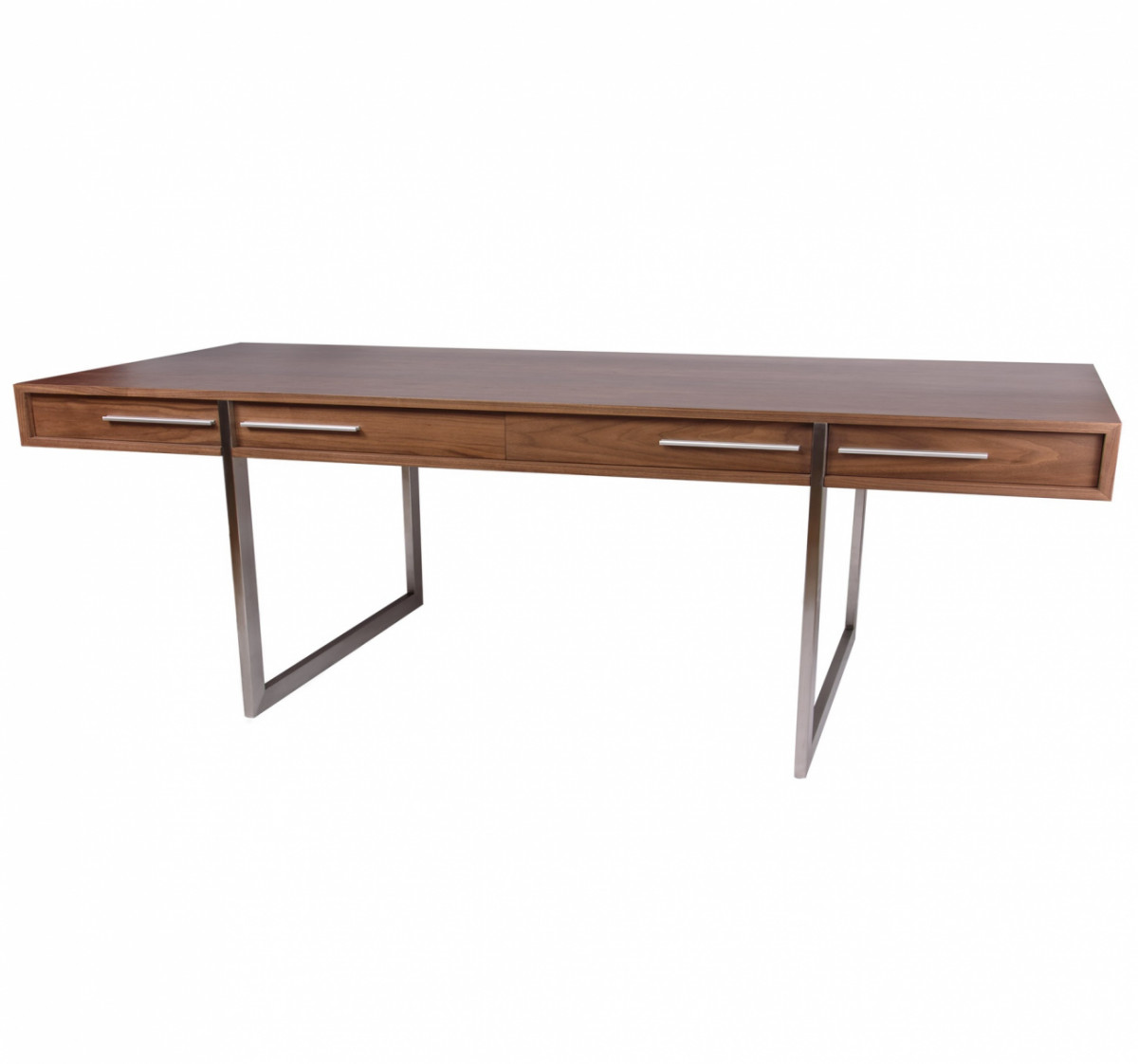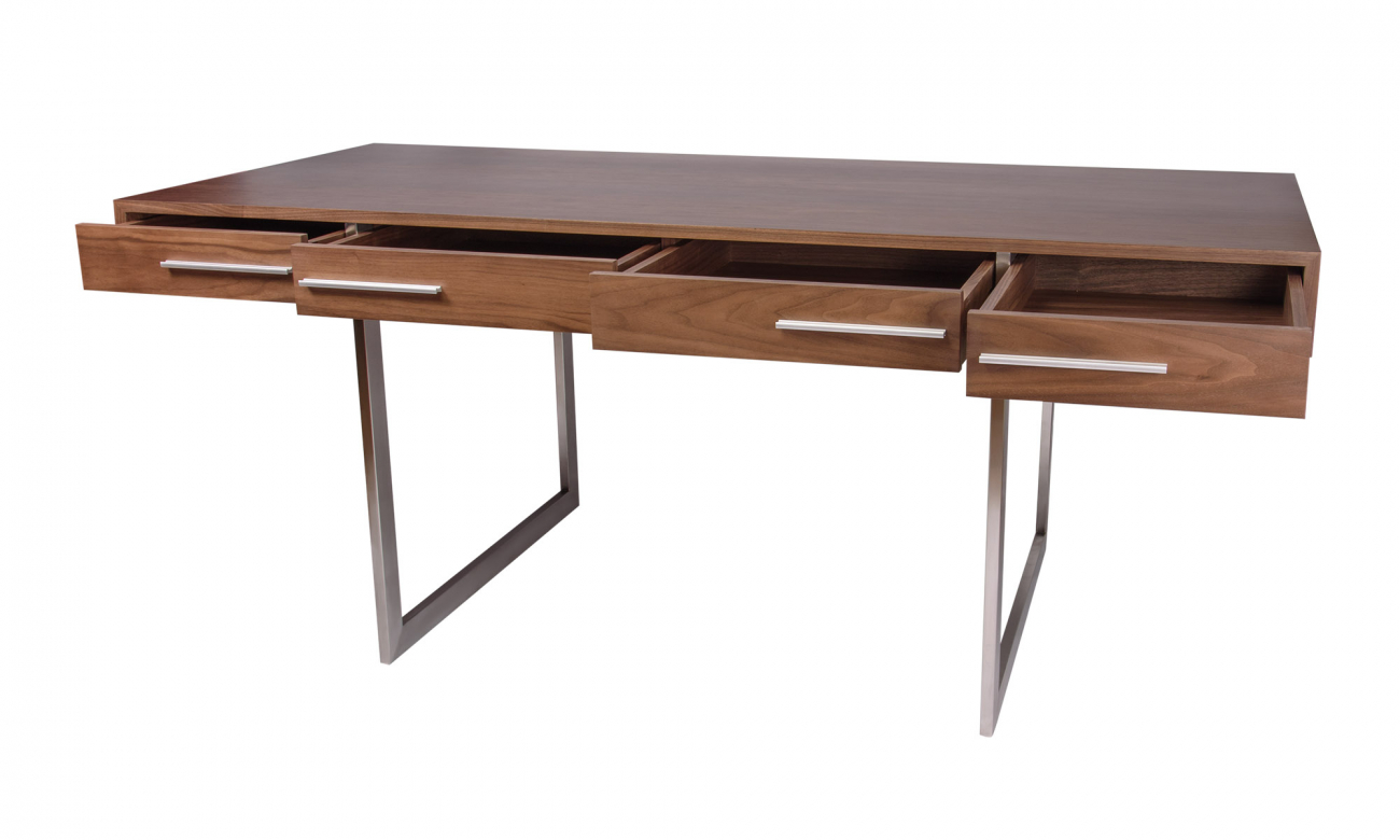 Массивный письменный стол Loodon благодаря сочетанию рабочей поверхности из шпона американского ореха и металлической фурнитуры и ножек в современном стиле оптимально впишется в интерьер рабочего кабинета в стиле модерн, классика и даже хай-тек. В конструкции предусмотрены объемные выдвижные секции для хранения документов и различных принадлежностей. Элегантный предмет мебели для любителей дизайнерских решений в интерьере.