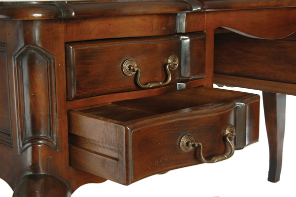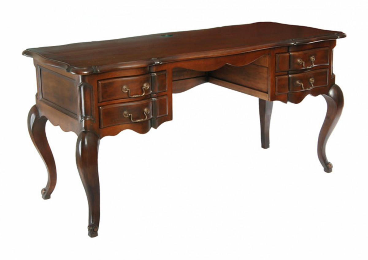 Этот добротный письменный стол украсит любой кабинет, оформленный в стиле прованс. Фигурный контур столешницы и подстолья, причудливые ножки, резьба, кованые ручки на ящиках – эти детали не оставят равнодушными любителей аристократического шика. Письменный стол «Вандом» выполнен из массива ленга и имеет красивый насыщенный цвет и фактуру ценной древесины. Аксессуар не только потрясающе выглядит, но и отличается функциональностью: он снабжен четырьмя выдвижными ящиками, а в столешнице предусмотрено отверстие для проводов. Стол письменный Вандом темно-кориневый