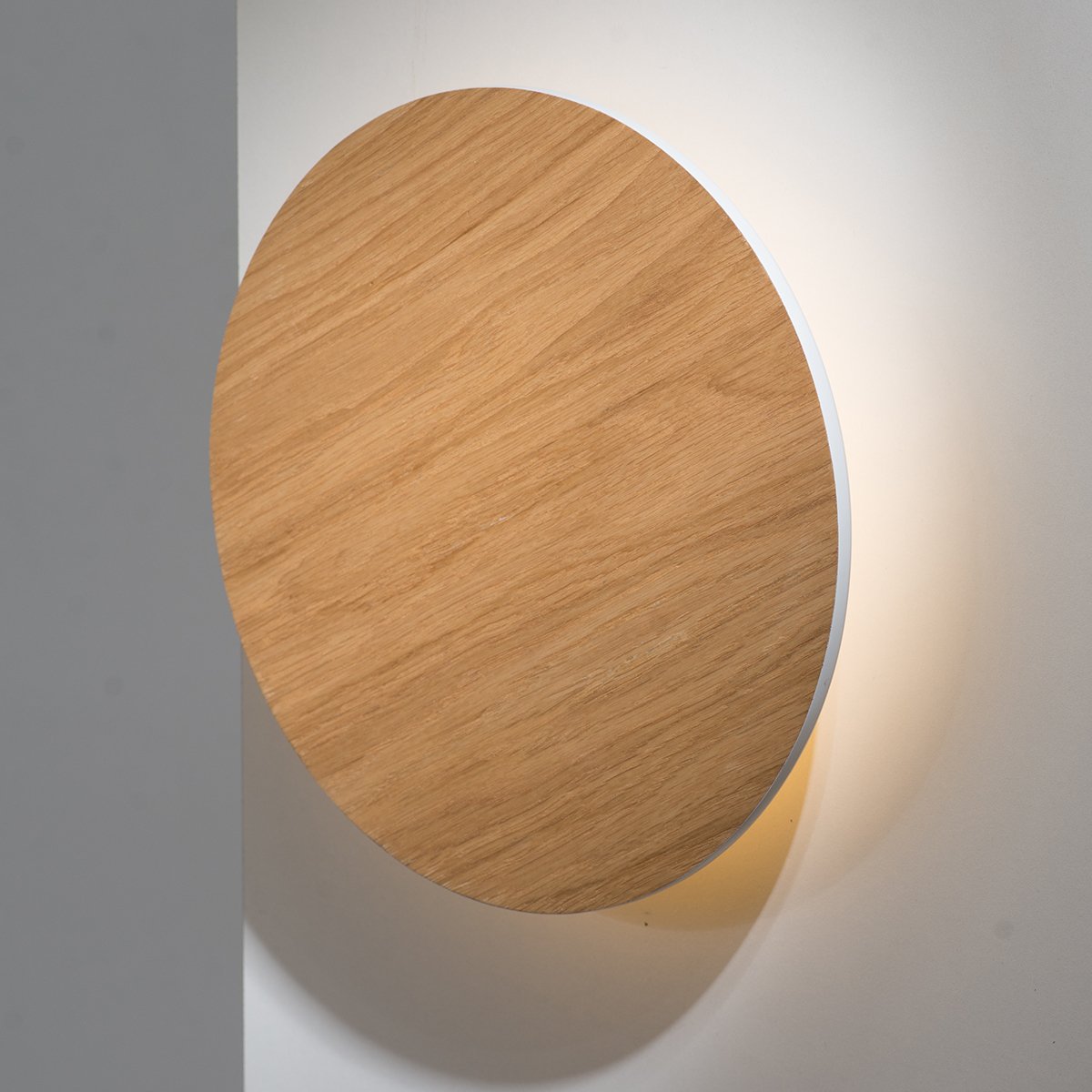 Настенный светильник Woodled шпонирован дубом, имеет минималистичную круглую форму и идеально подойдёт для современного дизайна интерьера. Дерево покрыто натуральными маслами, которые максимально «проявляют» всю красоту текстуры и натуральные волнообразные линии. Простая форма плафона прячет и крепёж, и источник равномерно распределённого света. Для повышения световых характеристик, оборотная сторона покрыта белым цветом.